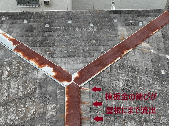 まず目についたのが、屋根の頂上に設置されている棟板金(むねばんきん)の錆です。