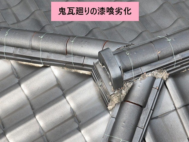 さらに、屋根の端にある鬼瓦まわりの漆喰も傷んでいました。