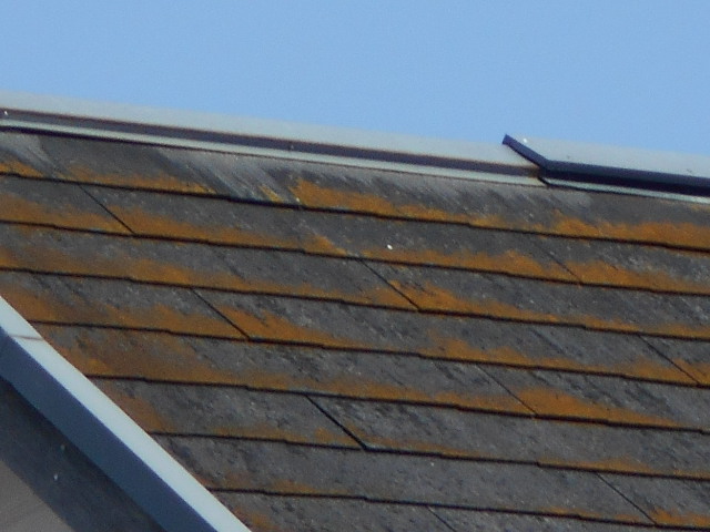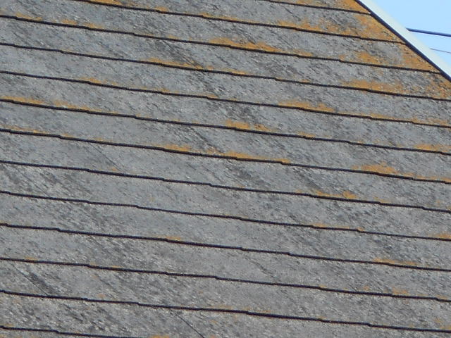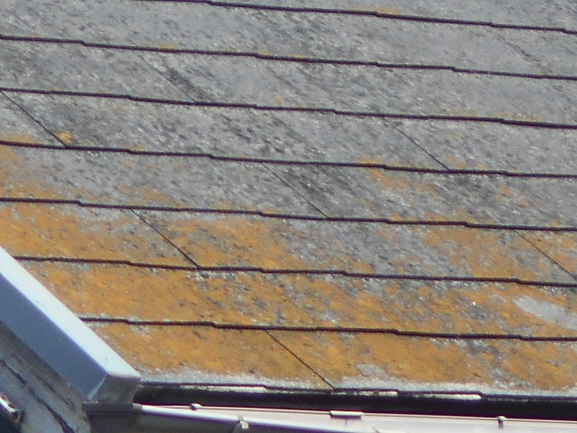 屋根全体の風景ですが、塗膜の劣化とコケや藻も多く広がってしまっており、屋根の状態として良いとは言えない状態です。