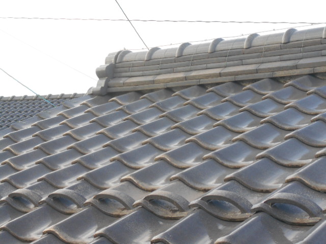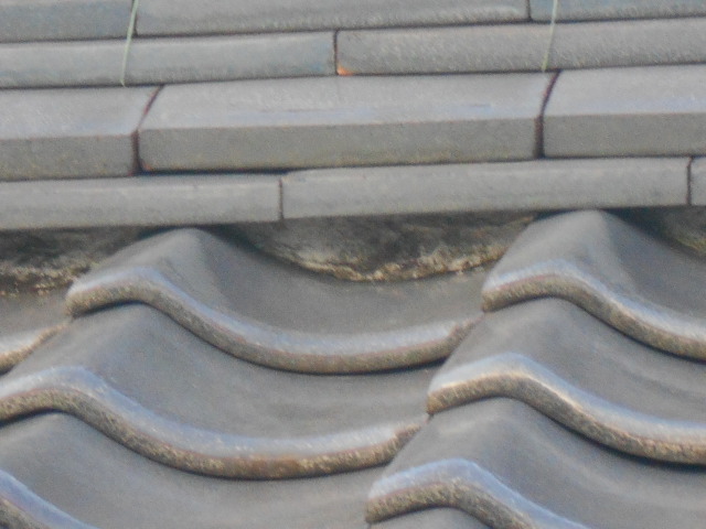 写真は漆喰が剥がれてきている状態で棟瓦の盛土が見えて少しずつ流れている状態です。