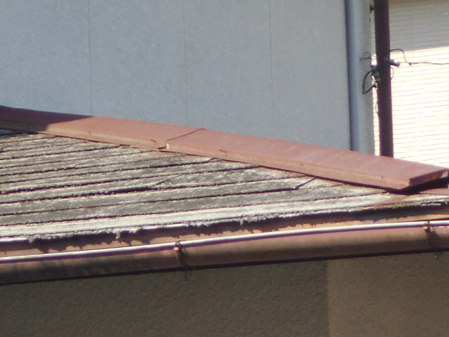 棟の頂点を止めている鉄板のことで一番風圧のかかる所ですので建物の揺れや風に板金が煽られて徐々に浮いてきていました。