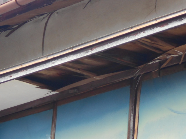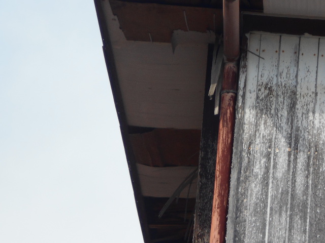 強風によって軒天の傷みが始まっていた部分が剥がれてしまったようです。