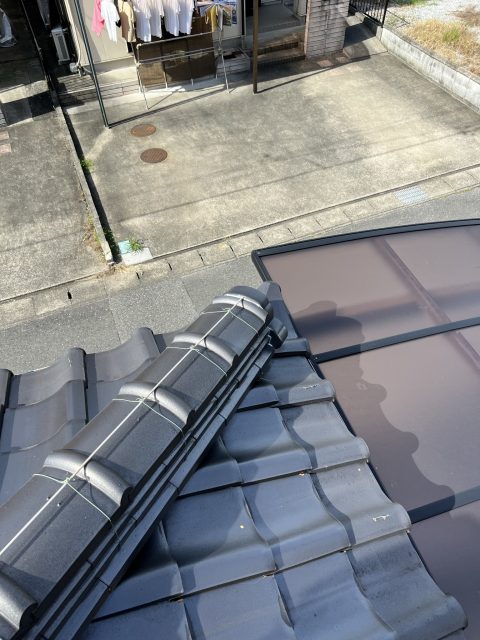 輪之内町のお住まいの瓦屋根を点検してきました。小さいですが、屋根の上に白いコンクリートの破片のようなものが落ちていました。屋根の上では私たちのような業者しか確認できませんが、場合によっては屋根の上だけでなく庭先やバルコニーなどにも落ちていることがあるので、普段から注意して確認してみてください。