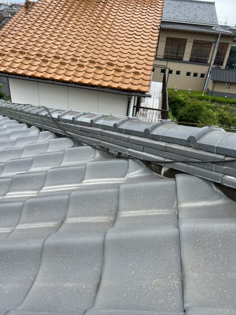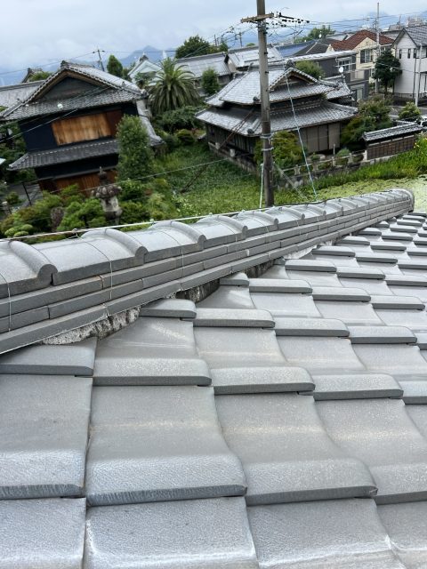 漆喰が剥がれた状態で長期間放置すると漆喰が無くなった箇所から雨水が入り込み、雨漏りへ繋がっていく可能性があります。また、雨水の侵入によって棟内部の土が少しずつ流れ出てやがて棟が歪んでしまう事もあります。さらに漆喰は瓦同士を固定し、支える役目も持っています。漆喰が剥がれてしまうと瓦のズレや崩れが発生してしまうかもしれません。鬼瓦など大きな瓦が落下してしまうととても危険です。