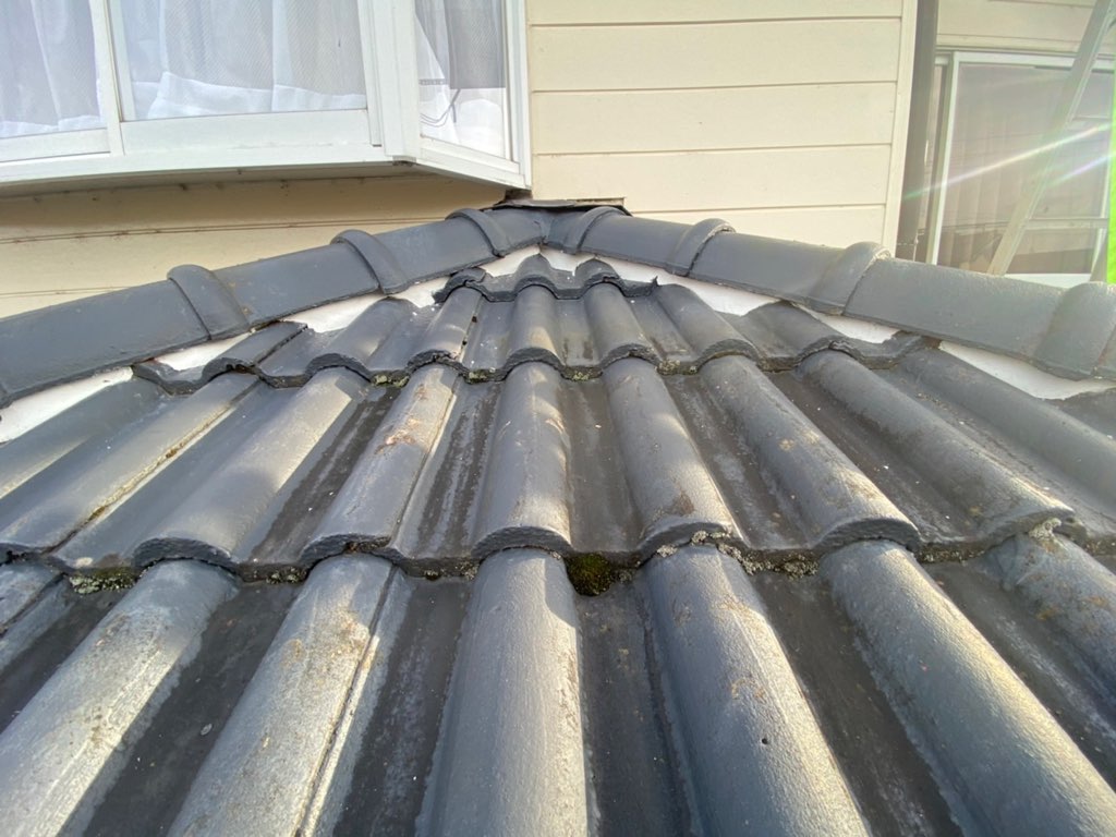 近くで見てみると、棟瓦が抜け落ちかかっている状態でした。