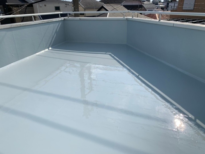 続いて屋根の上塗り一回目をおこないます。こちらも同様の塗料を使用します。スレート屋根に適した塗替え専用のシリコン樹脂塗料です。一回目の上塗り塗料が乾いたら2回目の上塗りをします。一回目塗料と同じ塗料を使います。