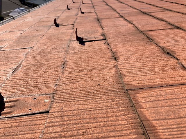 さらに、隅棟を見てみると、角の小さなスレート板がズレて隙間ができていました。経年による劣化とは別ですが、こうしたトラブルもあるため、屋根は定期的に点検が必要なのです。