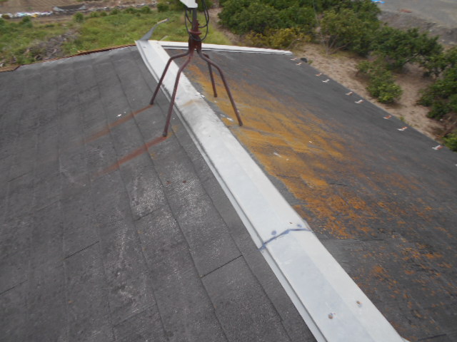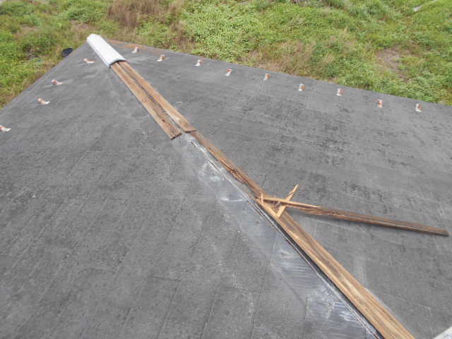 現場に行き屋根に登りましたら、棟板金がはずれて飛んでいってしまい芯木がむき出しの状態でした。