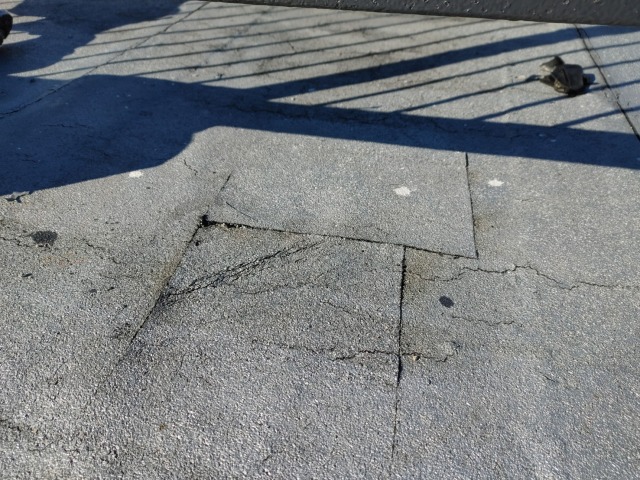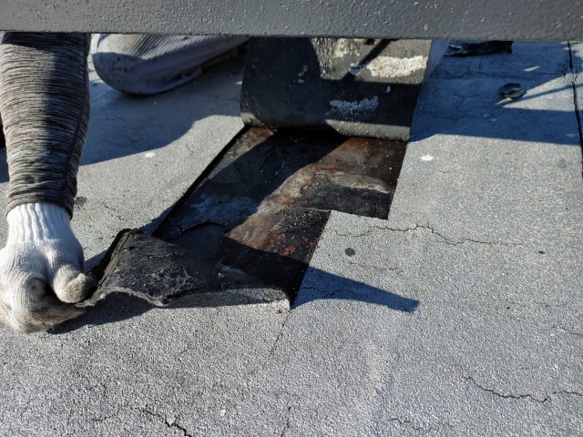 既設のアスファルト防水が剥がれている個所や空気が入り込み膨れができている個所も見られます。