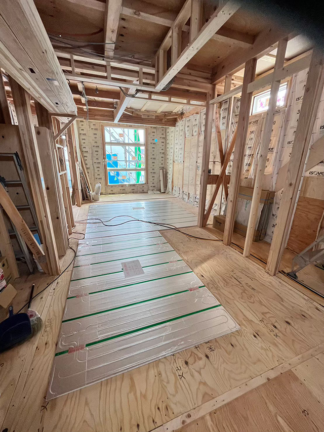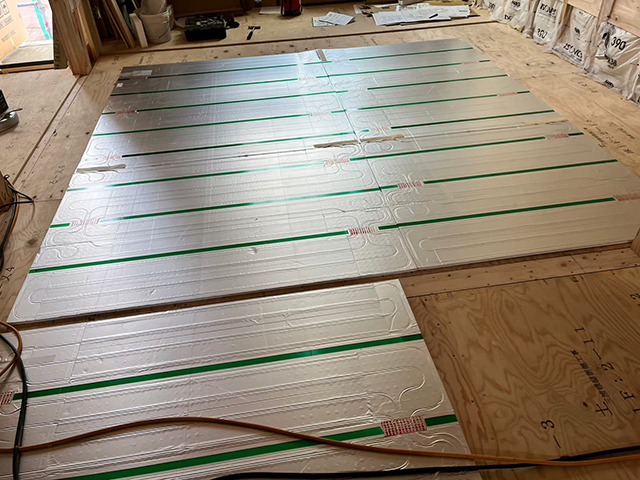 こちら床暖パネルの設置状況です。この床下に敷いたマットに、熱源機で作った約40~60℃の低温水を循環させてお部屋全体を暖めるんですね。ちなみに長いものが2畳用、短いものは1畳用です。