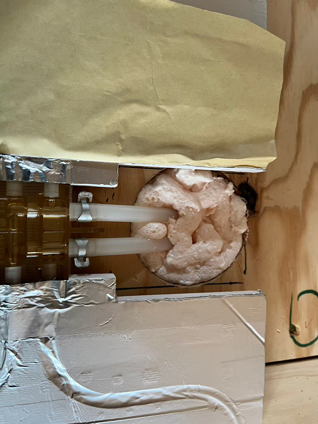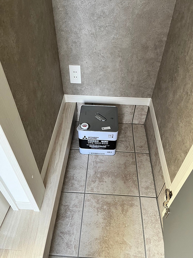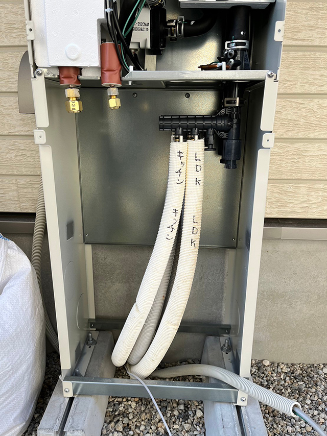 写真右は、熱交換器の内側の写真です。キッチン用とリビング用の床暖パネルの排水管が繋がっています。