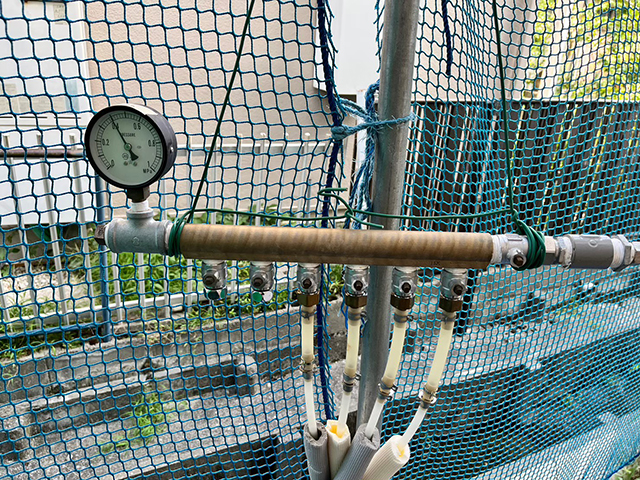敷設&接続後には、配管に圧をかけてきちんと溶接が出来てるかのテストをします。床を張られた後に漏れがあったら大変です。