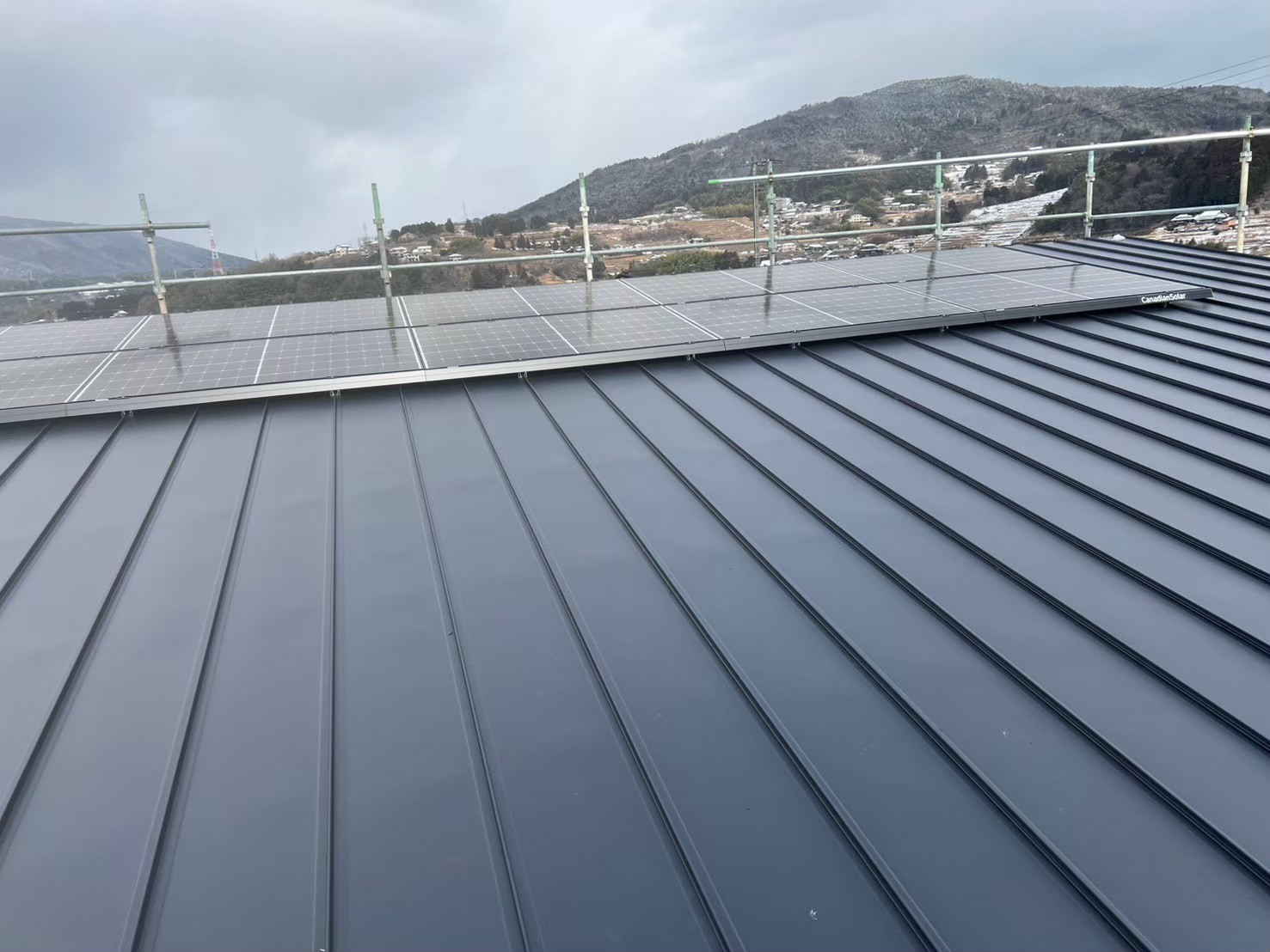 実は、当日朝は雪が積もっていましたが、除雪して作業を進めました。金属立平葺き屋根は、縦方向に長尺な屋根材を使用しているので、水はけがよいという特徴があります。