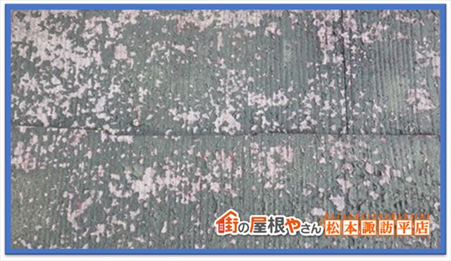 既存スレートの状況です。塗膜がペリペリと剥がれています。スレートはセメントと繊維質を混ぜて板状の成形したものです。それ自体に防水性がないので塗装によって防水しています。その塗装が剥がれてしまうと屋根材はどんどん水を吸って脆くなり、割れやかけ、爆裂などを起こします。早めかつ定期的な塗装のメンテナンスが必要な屋根材です。