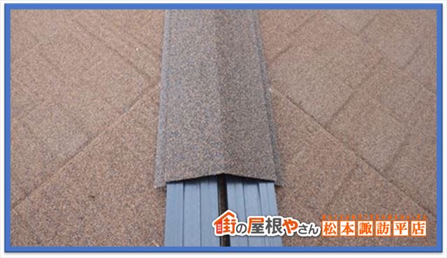 棟の施工です。勾配方向の違う屋根がぶつかるところに棟があります。ここは既存の棟を撤去しないと新たに取り付けできないので撤去してからの取り付けになります。下地には通常木材を使うのですが、腐食の心配があるので弊社では樹脂製の下地材を使用します。