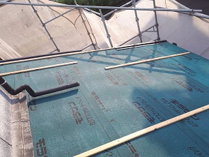 屋根セメント瓦からコロニアルへの葺き替え工事、コロニアル葺きを行っていきます。先日改質アスファルト防水を施工し終えたところで終了していました。