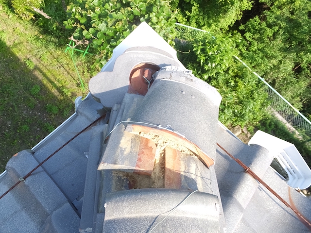 鬼瓦が重みで外れ、上に乗っていた「冠瓦」と中の「のし瓦」と呼ばれる積み上げた瓦がくずれている状態です。