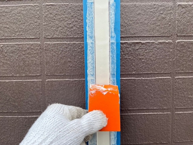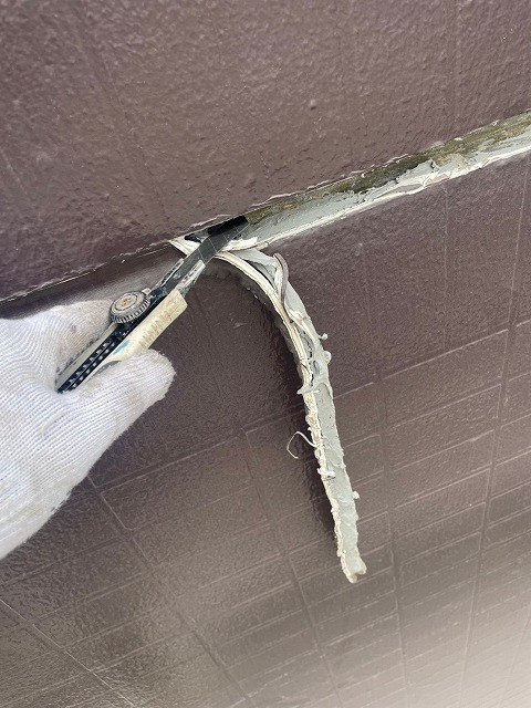 こちらは既存シーリングと、シーリングを撤去したサイディングの継ぎ目の様子です。シーリングはサイディングの継ぎ目から雨水が浸入しないよう補填している役割を果たしていますが、経年劣化が進行するとひび割れや剥離が生じて本来の機能を果たせなくなります。