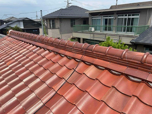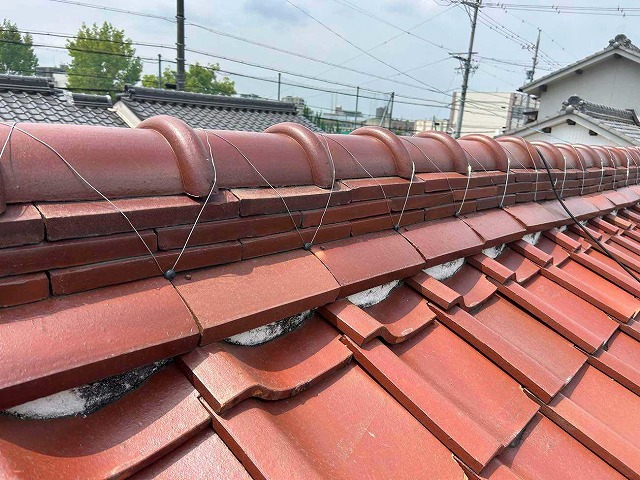 棟は瓦屋根の頂点で、瓦を押さえ、屋根と屋根の隙間をカバーする重要な部分です。昔ながらの瓦屋根では、棟は棟番線と呼ばれる針金で固定されています。しかし、こちらのお宅では、棟番線がまったくない状態になっていました。