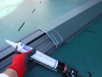 板金との重なりを50㎜以上取り雨が入らないようコーキングをうちます。