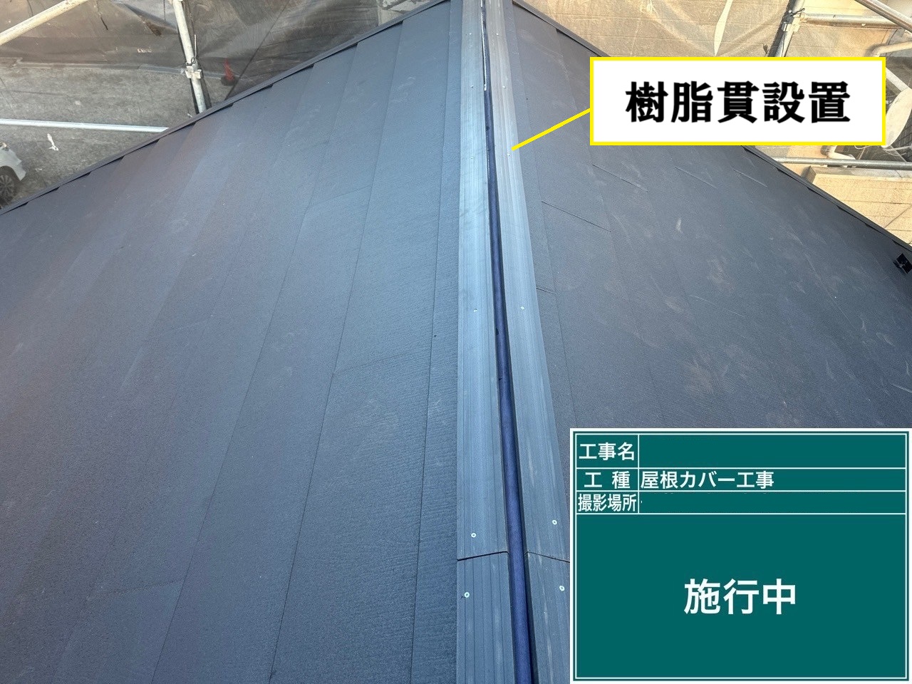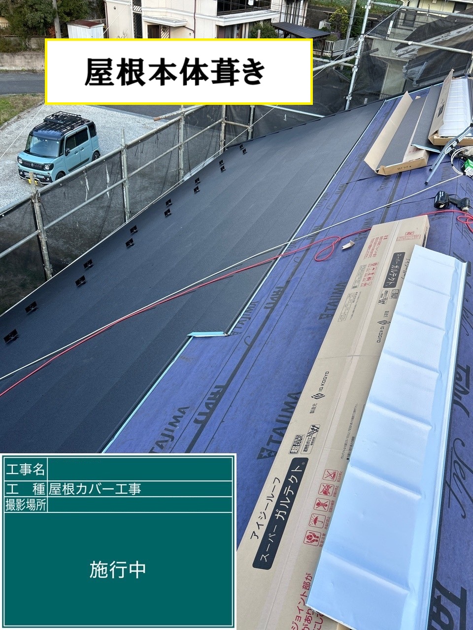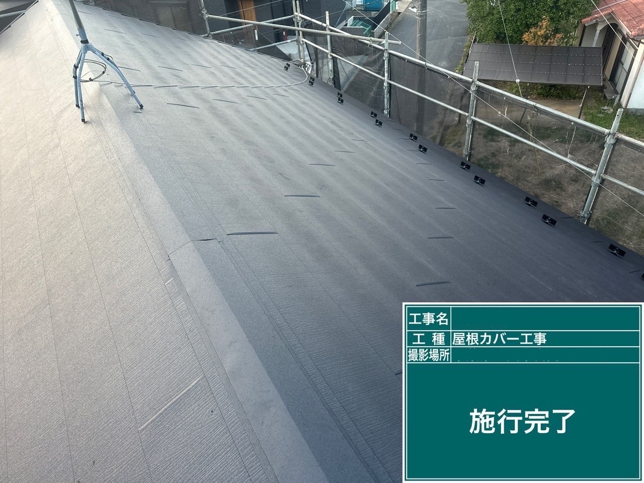 今回は、既存のスレート屋根の上から新しい屋根材を重ねる「屋根カバー工法」にて、耐久性・断熱性に優れた『アイジー工業 スーパーガルテクト(色:ブラック)』を使用した工事を行いました。