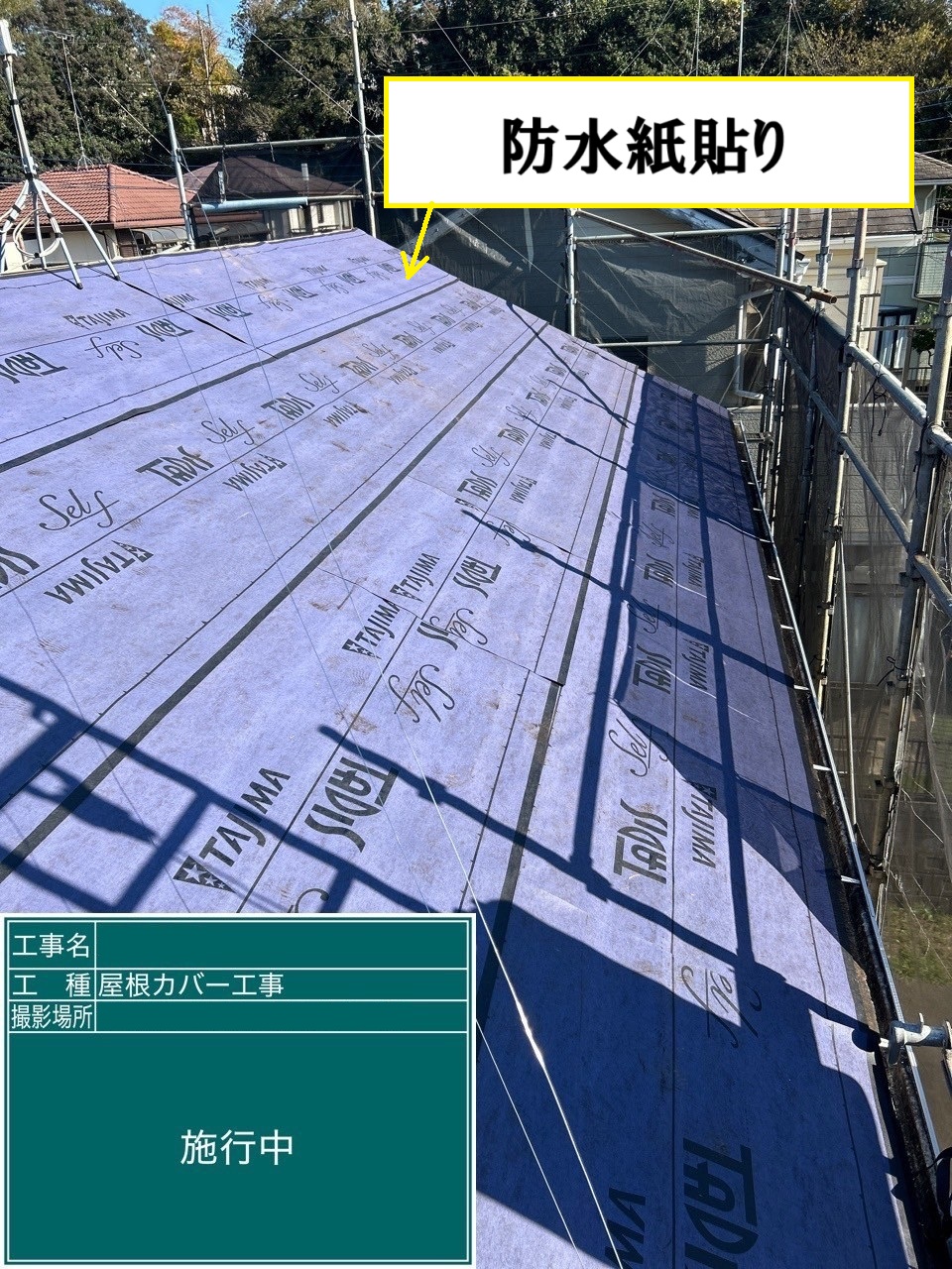 屋根カバー工事では、新しい屋根材を載せる前に「ルーフィング」と呼ばれる防水シートを敷きます。