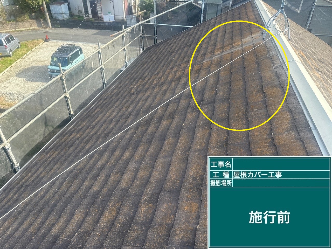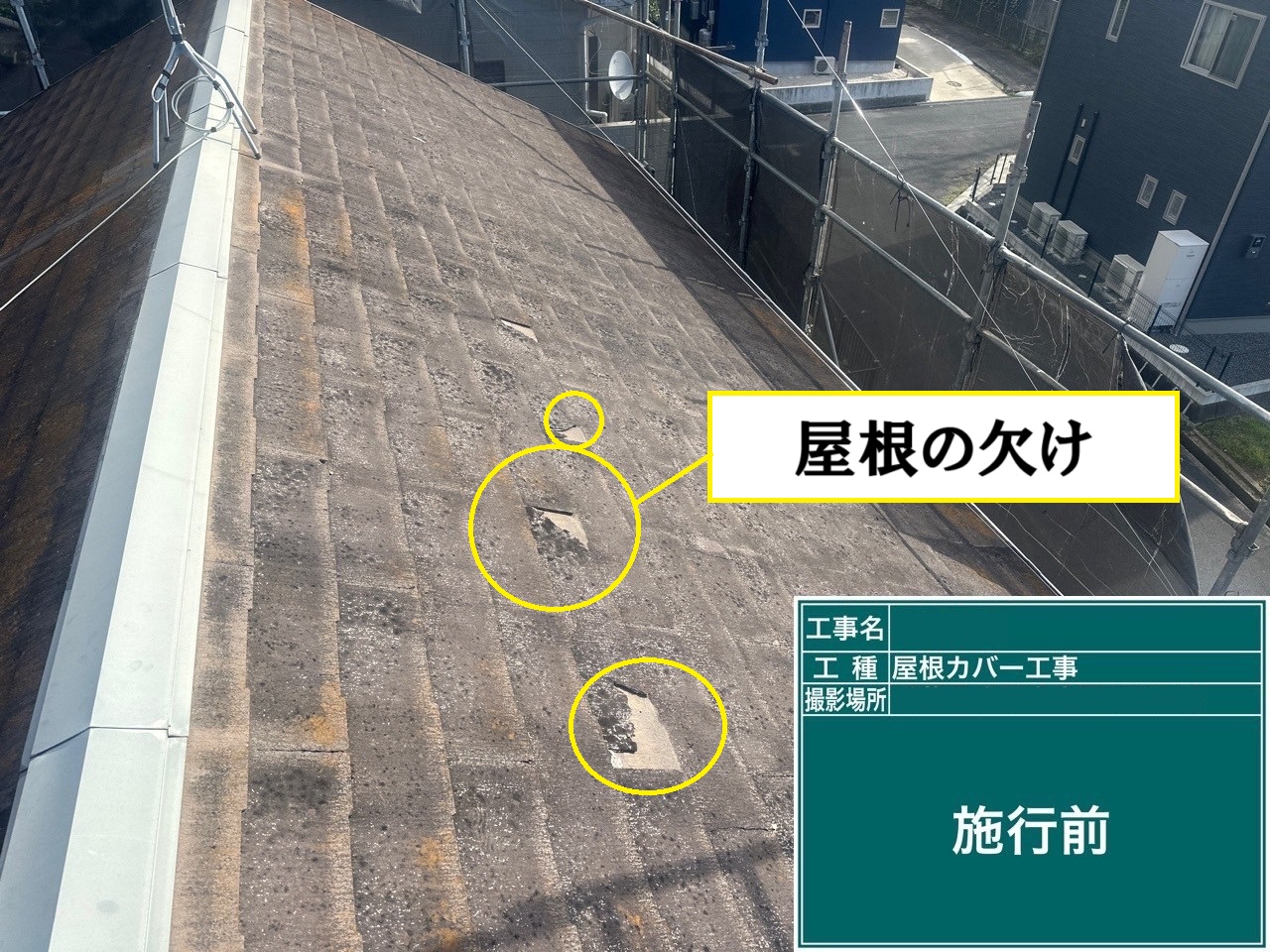 現地調査を行ったところ、スレート屋根全体に色褪せや黄カビが広がっており、一部には欠けている箇所もありました。