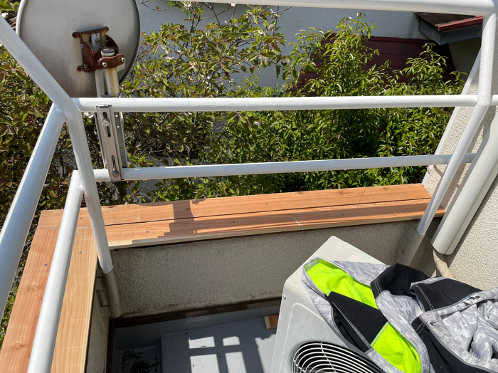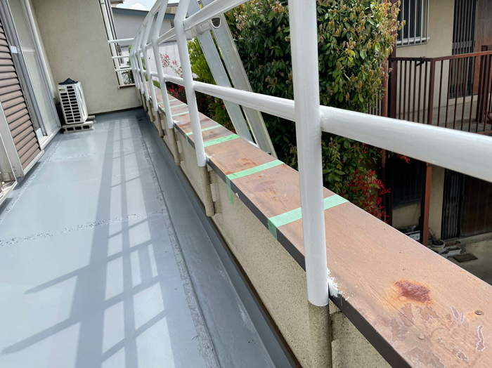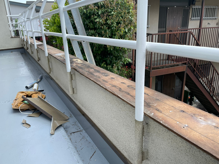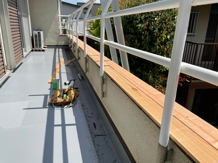 今回は、ベランダ部分は、モルタル壁で大きなひび割れも確認できず、防水層もしっかりしていたので、笠木のみの交換工事を行います。