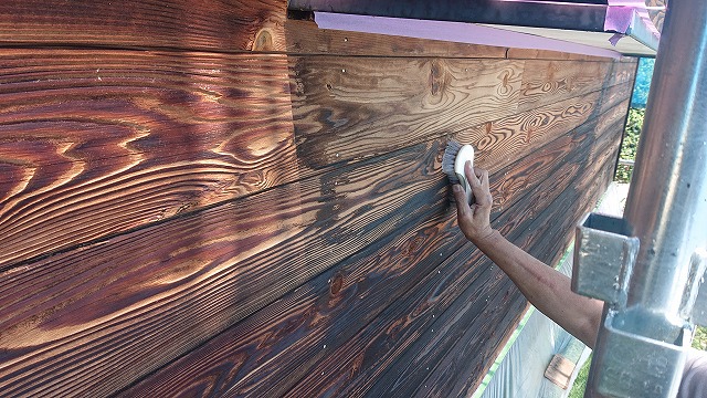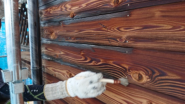 ブラシでのケレン作業が終わりハケで防腐剤の塗装が開始されました。木部用の塗料は塗るのではなく、防腐材を木目にしみ込ませていくような感じで塗って行きます。