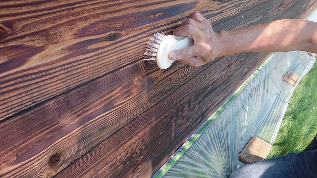 黒くなった木目に合わせて、ブラシを使ってカビを取り除いていきます。通常のブラシではなく固めのブラシを使い削っているような感覚です。