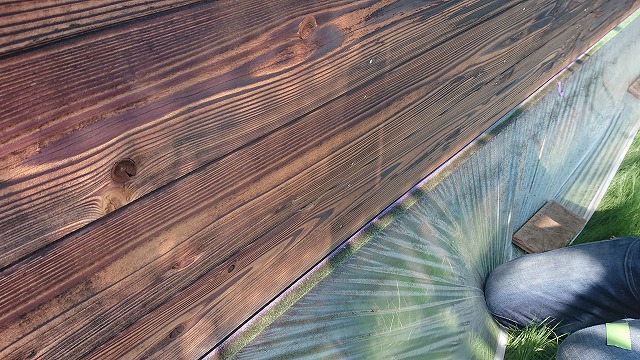 つなぎ目のハケ入れが終わり、本格的に防腐塗装がはじまります。濃いブラウンの色を選び綺麗に仕上げて行きたいと思います。
