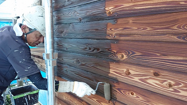 前回のブログにて養生作業が完了していた所です。本日より木部の塗装作業に入っていきます。この現場は東面と北面の増築を行った部分が、木板を使った外壁になっています。一度ご主人様がご自分で塗装を行っていましたが、ご高齢になり今回は当社でお世話になります。