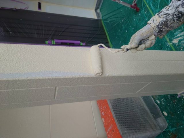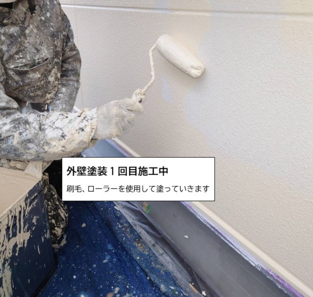 外壁塗装上塗り(1回目)下塗りを塗り終えて乾燥させてから、