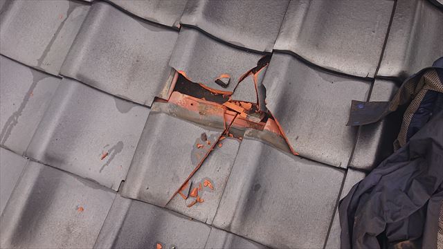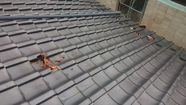 鬼瓦が大屋根より落下し下屋根の瓦を破壊し転がり落ちたのがわかります。