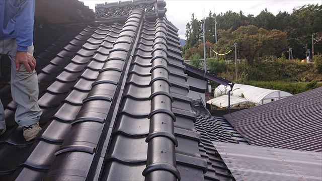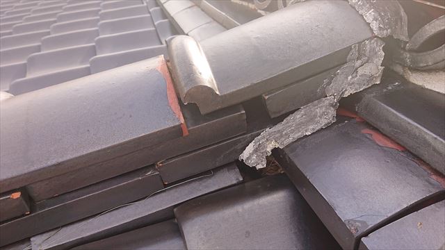 何が怖いかと言うと、鬼瓦は棟瓦の中に銅線が入っていて、棟の付根から引っ張って棟瓦が落ちないようにしていますが、大きな力が加わるとこの棟が引っ張られ、銅線が切れてしまうことです。