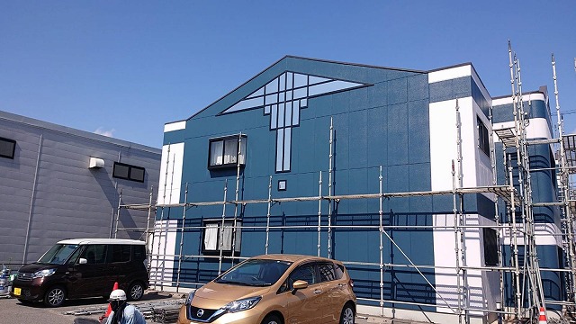 ホーム > 塩尻市にてアパートの外壁塗装!!上塗り完成と足場の解体作業