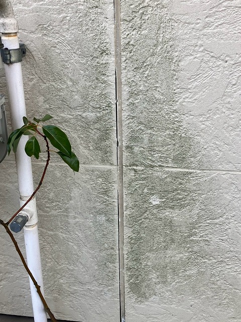 外まわりをくまなく確認したところ、コーキングのひび割れや目地の隙間、苔の発生、外壁の色あせなど、経年劣化のサインがいくつか見られました。