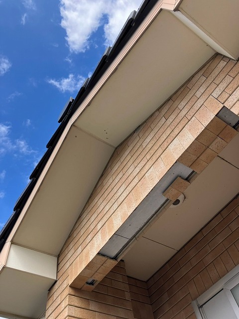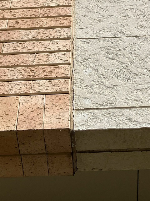 点検の際には、外壁タイルにもいくつか気になる点が見られました。こちらの写真では、タイルの一部がわずかに浮いており、目地にも隙間ができはじめている状態です。また、軒天まわりではタイルが剥がれて内部が露出している箇所もありました。こうしたタイルの浮きやズレ、剥がれは、見た目の問題だけでなく、落下や水の侵入といったリスクにもつながるため、早めの確認と対応が大切です。
