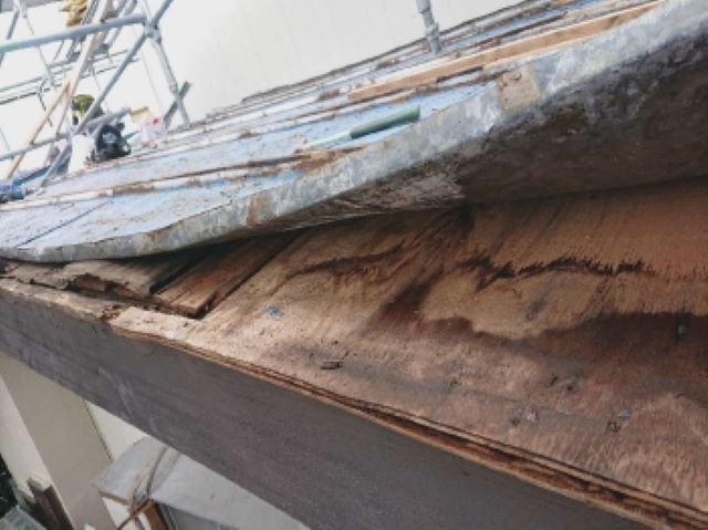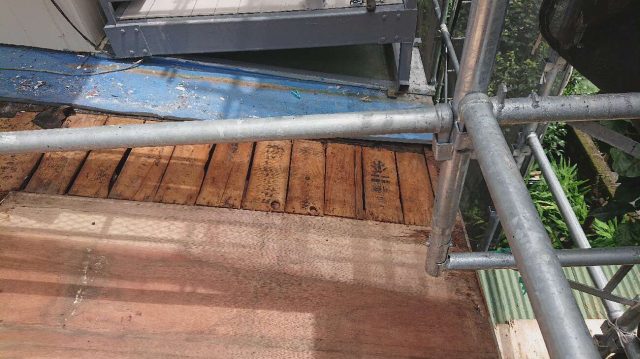 雨漏りが発生した下屋根、野地板が雨水の侵入で腐食して傷んでいます。深刻な状況ですね。