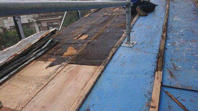 野地板の張り直し→防水ルーフィング施工→瓦棒屋根施工で葺き替え工事をしていきます。