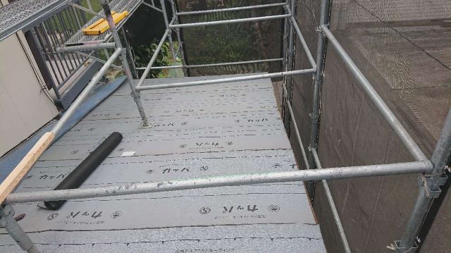野地板の上に防水紙でルーフィングを施工していきます。内部に水が浸透しておこる劣化や腐食を防止します。