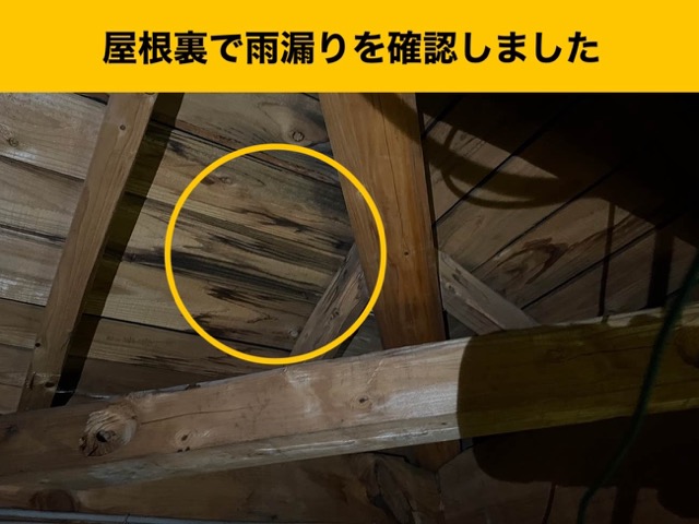 現地調査では、まず天井裏に広がる黒い雨じみを確認しました。これは、長期間にわたり雨漏りが進行していたことを示す明確な証拠です。