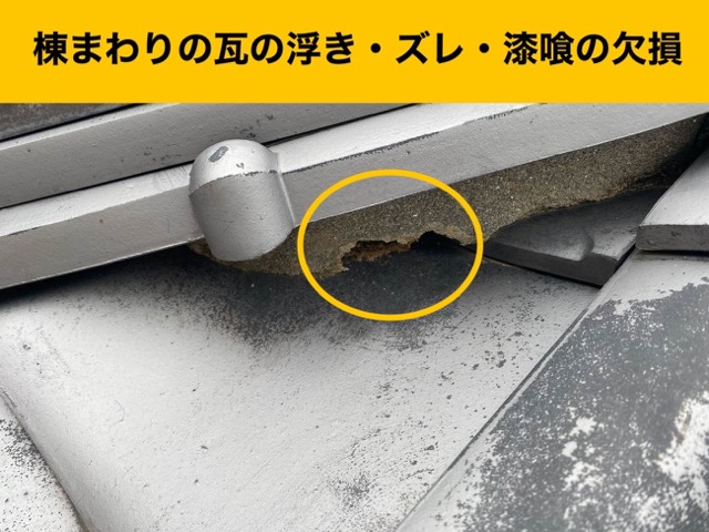 屋根に登って詳しく調査したところ、雨漏りの主な原因は棟まわりの漆喰の劣化と瓦のズレであることが判明しました。