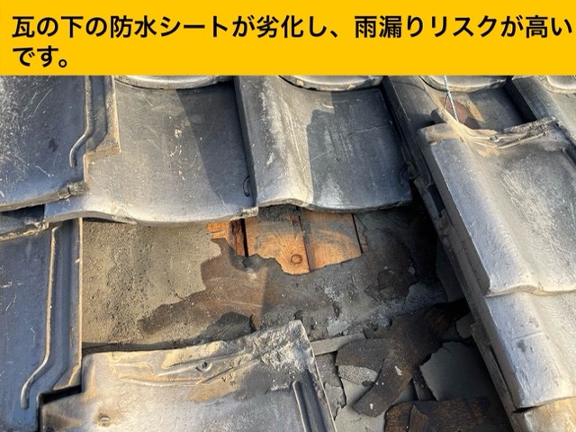 築60年以上が経過し、これほど広範囲に劣化が進んだ瓦屋根を放置することは非常に危険です。 瓦の破損や防水シートの破れは、雨漏りの直接的な原因となります。雨水が屋根下へ侵入し続ければ、下地の木材だけでなく、垂木や梁といった建物の構造体全体が腐食し、耐久性や耐震性が著しく低下します。 最悪の場合、家屋の倒壊リスクも高まり、大規模な改修費用が必要になるだけでなく、住人の安全を脅かす事態にもなりかねません。また、腐食した木材はシロアリの温床にもなりやすく、さらなる被害を招く恐れもあります。