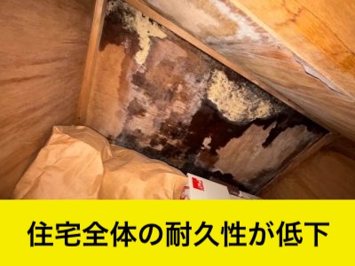 カビやシロアリの発生: 湿った状態が続くことで、屋根裏や壁内部にカビが繁殖し、アレルギーなどの健康被害を引き起こす可能性があります。また、腐食した木材はシロアリにとって格好の餌となり、シロアリ被害が急速に拡大するリスクも高まります。