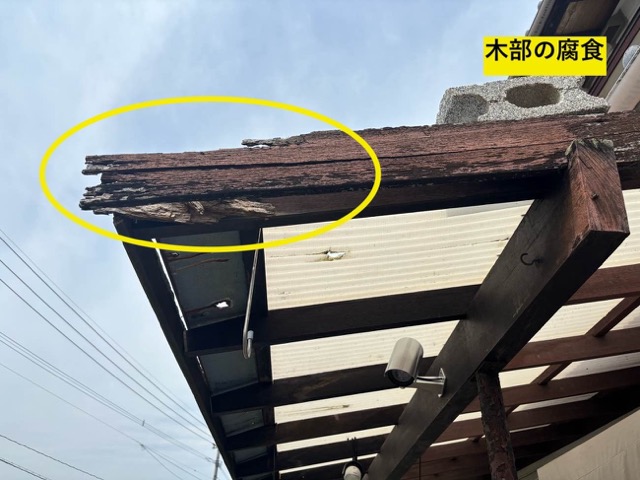 テラス屋根の波板が割れると、そこから雨水が骨組みの木材に染み込みます。