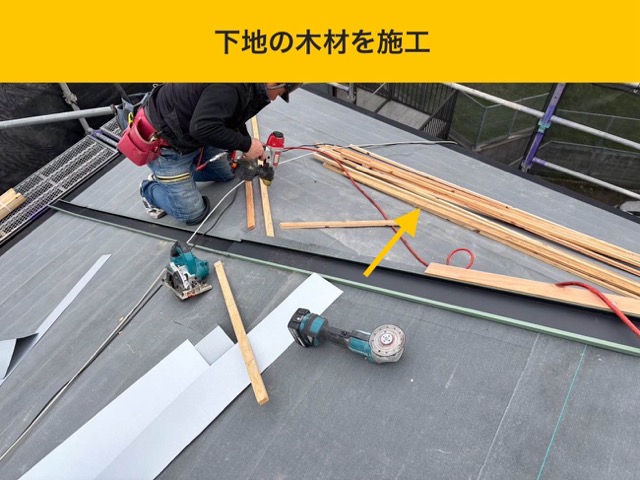防水シートが完了したら、次は新しい金属屋根材を固定するための「桟木」を打ち付けていきます。