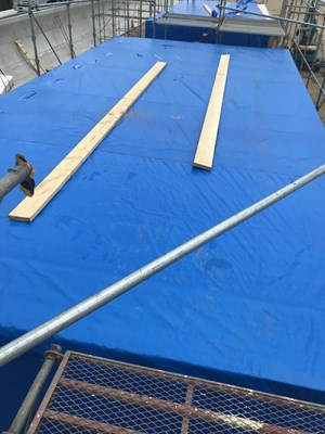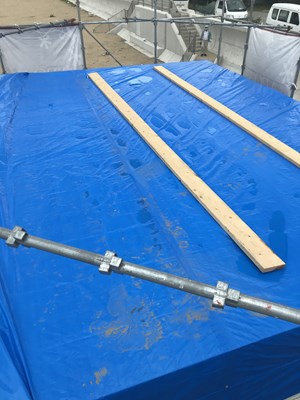 この時期、雨も多いので建物は、ブルーシートで覆ってある状態ですね。