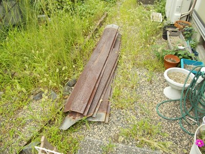 棟板金は庭に落ちている状態で、下地の部分がむき出しになっている状態です。
