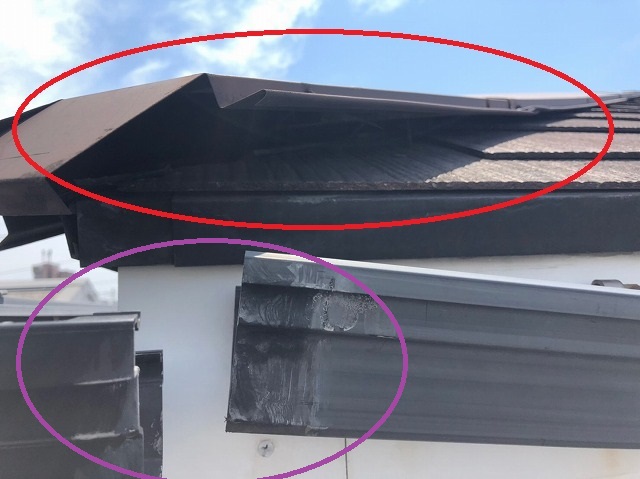台風被害により棟板金が曲がって浮き上がり、軒樋は外れてしまっている状態でした。